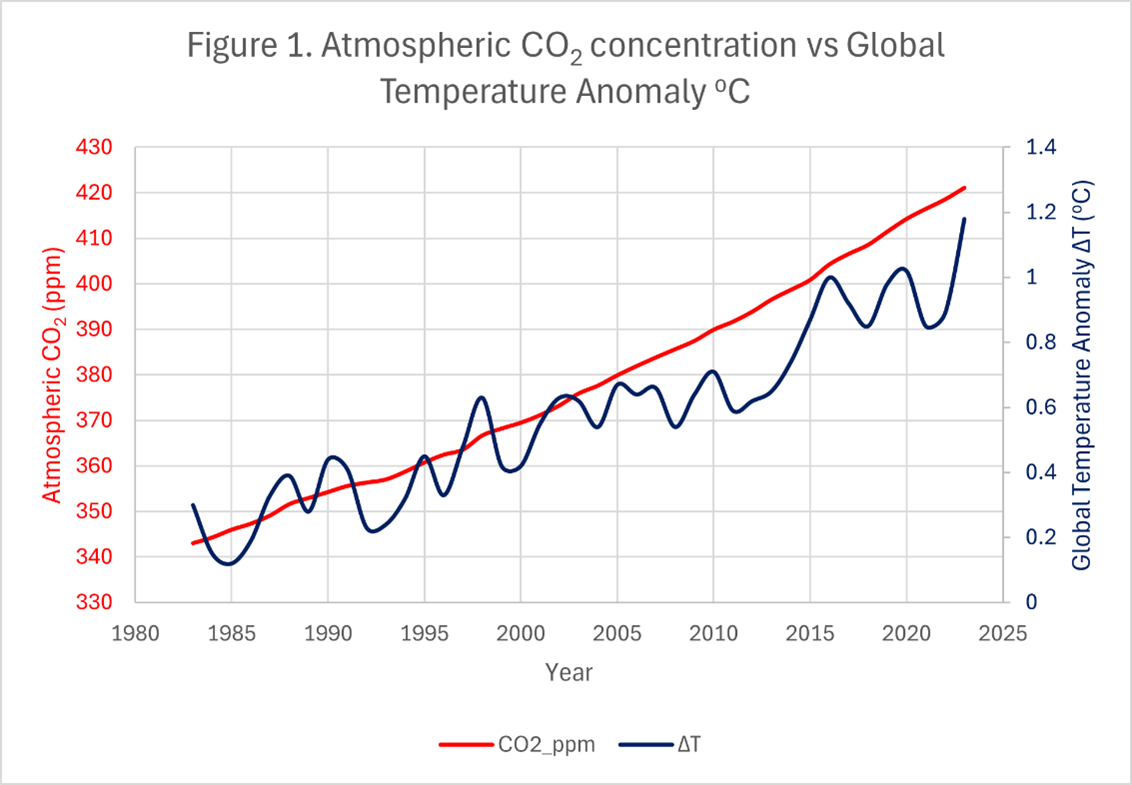 This relationship is illustrated in Figure 1, which compares atmospheric carbon dioxide concentrations measured at Mauna Loa with the global temperature anomaly since the early 1980s. The global temperature anomaly measures how much the Earth’s average temperature differs from a long-term historical baseline, with sustained warming becoming evident from the late 1970s onward. Although temperatures fluctuate from year to year because of natural variability in the climate system, the long-term trend shows a clear upward movement that broadly parallels the increase in atmospheric CO₂ concentration.