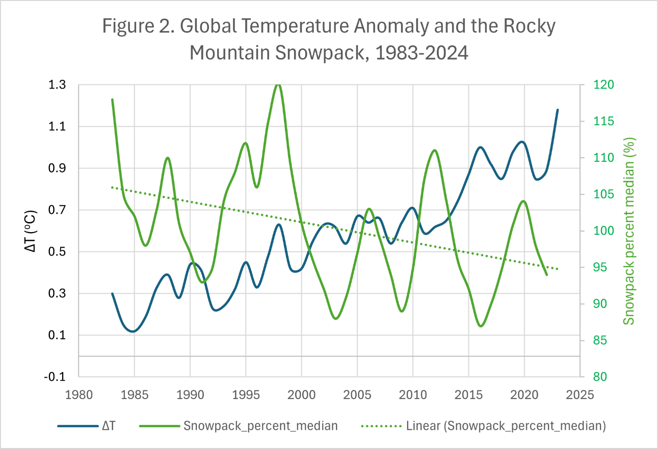 The relationship between rising temperatures and Rocky Mountain snowpack is illustrated in Figure 2, which compares the global temperature anomaly with measurements of snowpack expressed as a percentage of the historical median. Although the snowpack record shows considerable year-to-year variability, the longer-term pattern suggests a gradual decline over the past several decades.