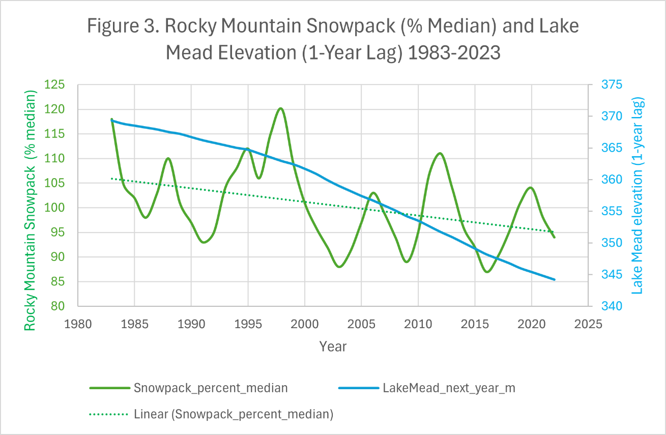 Figure 3 compares Rocky Mountain snowpack with the elevation of Lake Mead in the following year. The one-year lag reflects the time required for snow accumulated in the mountains to melt, flow through the river system, and influence the level of water stored in the reservoir. Although the relationship is not exact, variations in snowpack are reflected in subsequent changes in the level of Lake Mead.